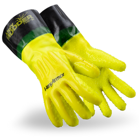 The HexArmor® Ugly Mudder® 7310 relies on a premium PVC-Nitrile dip to create the most durable lightweight, liquidresistant glove on the market. Our impact protection encapsulated within the outer layer provides continuous back-of-hand protection, in addition to greater durability and comfort. The pre-curved design and safety cuff make it easy to slide on and off. Additionally, the 7310 features a textured palm for added grip and durability when dealing with fluids.