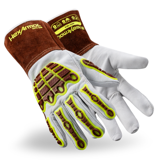 Built to handle extreme heat applications such as MIG welding, HexArmor’s HeatArmor® 5055 gloves are purposebuilt with industry-leading protection, fit, comfort, and longevity. The 5055 features a cowhide leather exterior with our revolutionary, longlasting HeatHide® leather treatment technology while an interior HPPE/ polyester/steel liner delivers 360° cut protection – allowing you to switch applications without switching your gloves. Plus, added sewn-on back-of-hand impact guards provide protection agains