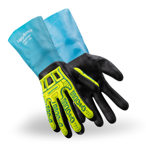 For workers who handle chemicals or deal with fluids of any kind, the HexChem® 7071 gloves put a barrier between workers’ hands and dangerous contamination hazards. A full double-dip nitrile palm coating provides superior grip and abrasion resistance, while an extended gauntlet-style cuff provides extra arm coverage in case any splashes occur. Additional safety features include a 360° industry-leading cut-resistant interior liner and back-of-hand impact protection for some of the safest gloves on the market in this category.